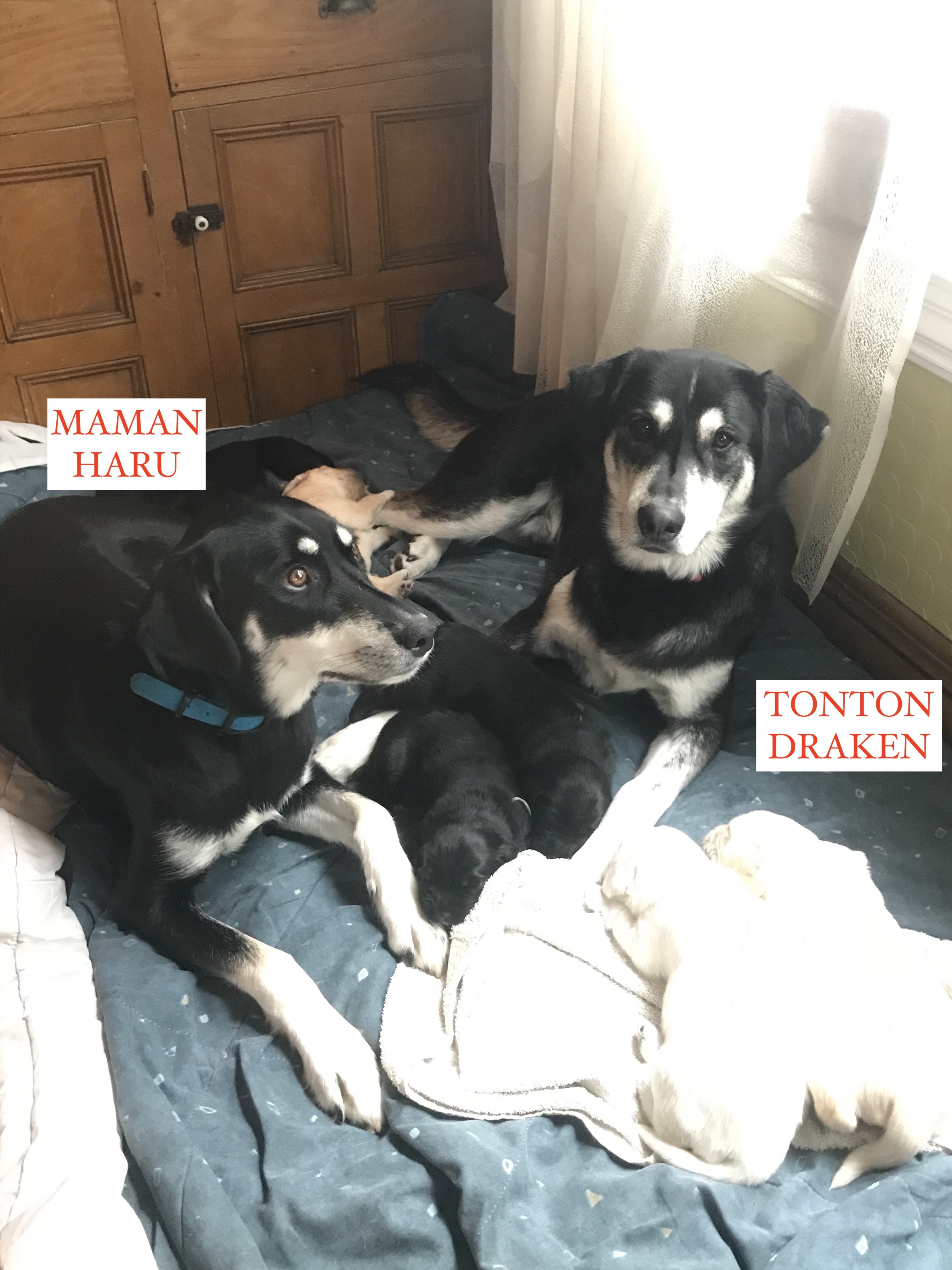 Nés le 19 octobre 2024, leur mère se nomme Haru, Golden Husky de 55 livres : c’est ma chienne et tout le monde la dit tellement douce et affectueuse. Le père, Guizmo, est un Golden de 80 livres dynamique et sympathique.