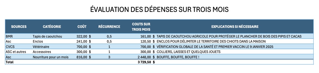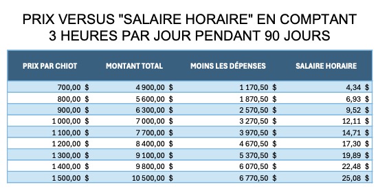 Bien franchement, je crois que le tout vaut au minimum… le salaire minimum ! Voilà pourquoi je propose à la base un prix 1200$ par chiot. Pour comprendre comment j’y suis arrivé, voir les deux tableaux au bas de la page.